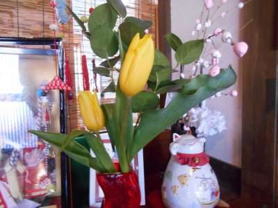 スタッフがひと足早い春の花チューリップを飾ってみ