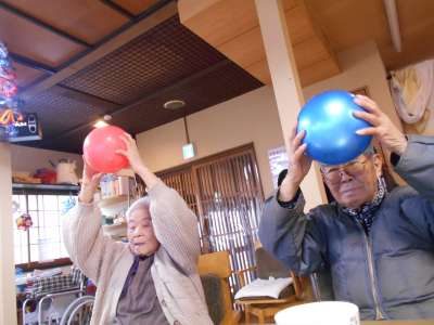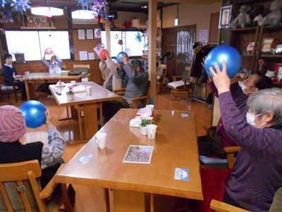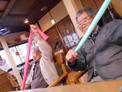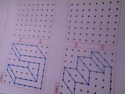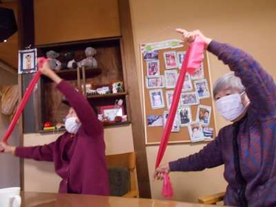 縦、横、斜めと音楽に合わせゴムバンドを伸縮させながら