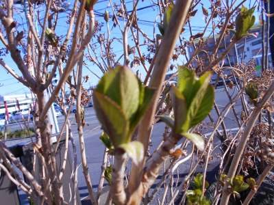 庭先の紫陽花の茶色い枝からはグリーンの葉が