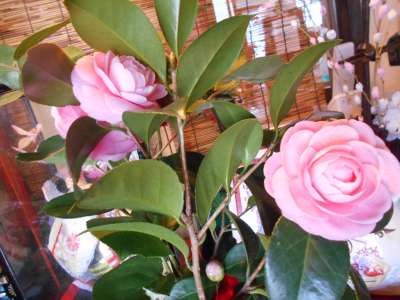 椿の花は玄関先で元気に皆さんをお出迎え準備です