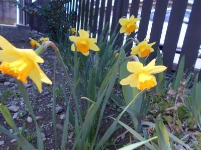 せっかく咲き始めた庭の水仙が北風に負けません様に…