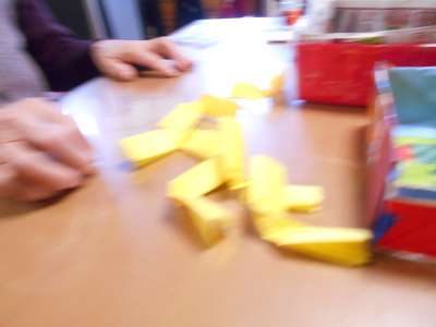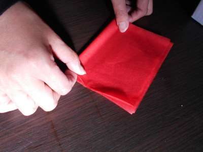 赤と黄色のお花紙を折ってねじって花びらにしてゆきます