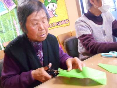緑のお花紙も折目をつけて丸ぁ~るい