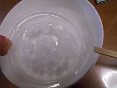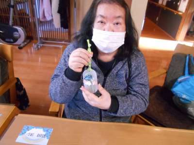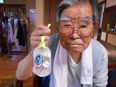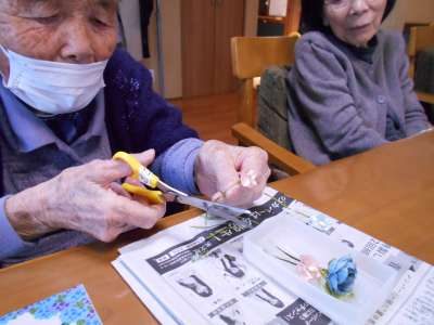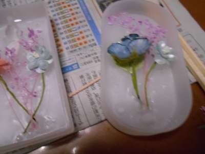 型に流したら、ろうが固まる前に、お花をきり飾ります