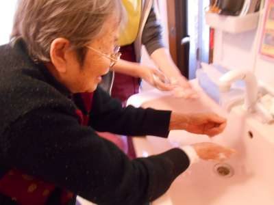 手洗いポスターを見て、スタッフと共に手洗い、うがいです