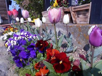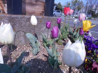 看板下のお花たち・・本日も色鮮やかです