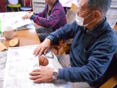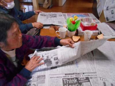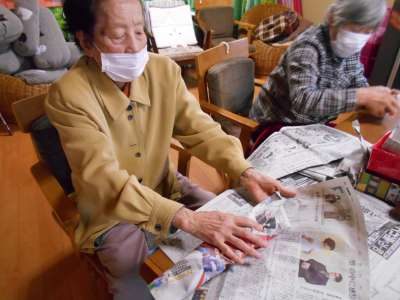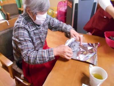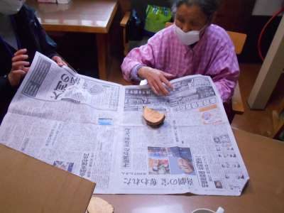 お芋を新聞で、くるんで下準備