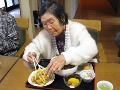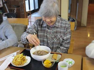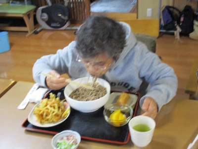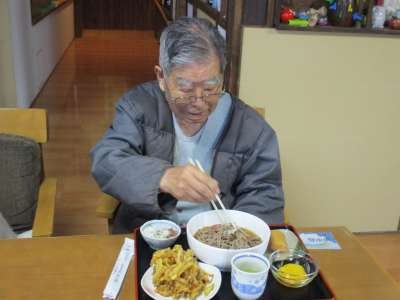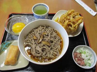 本日のランチは、そば、かき揚げ、おいなりさん、果物です