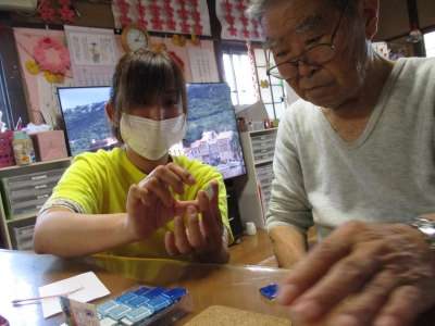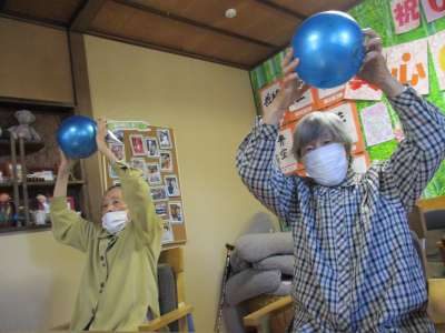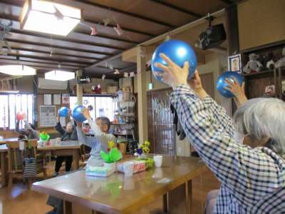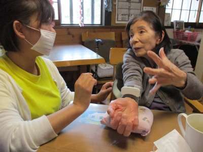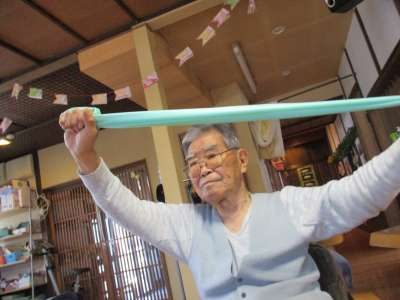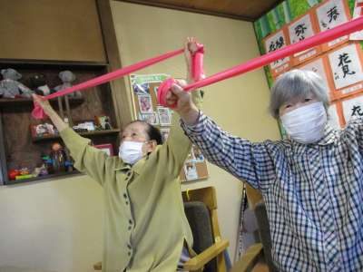 柔らかいゴムバンドで負荷を調整しながらの上肢運動