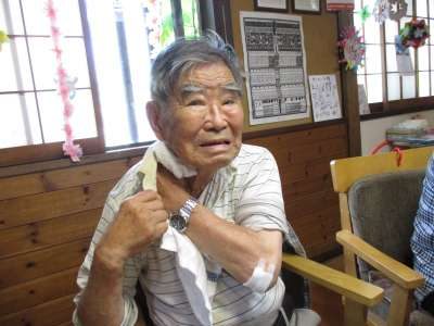 と汗を拭きながら冷たい麦茶を飲む父です