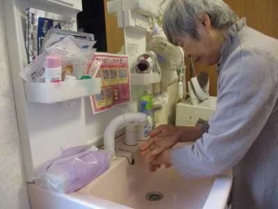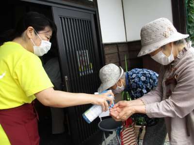 庵内に入る前に、しっかりアルコール消毒をしていた