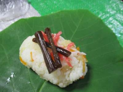 結んだ俵にぎりの上にきゃら蕗と生姜を乗せて朴葉の上に