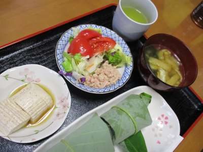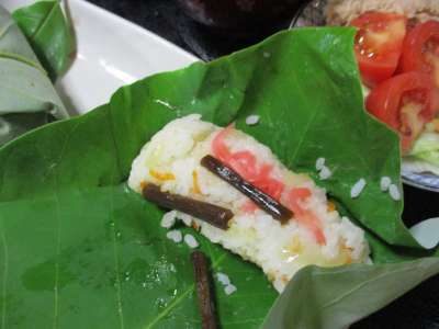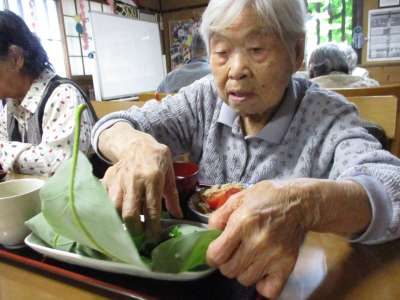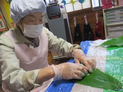 魚や山菜を具材としたちらしずしを朴の木の葉に包んだ