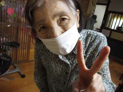 カメラを向けるとマスクをとって笑顔を見せてください