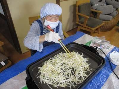 もやしを味付けし炒めます