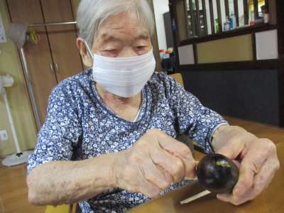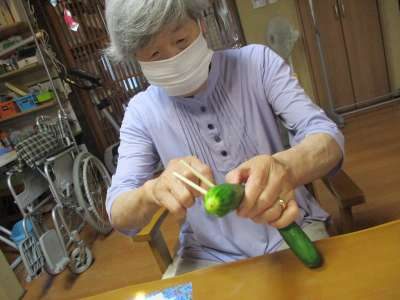 胡瓜の馬、茄子の牛に割り箸で足をつけます
