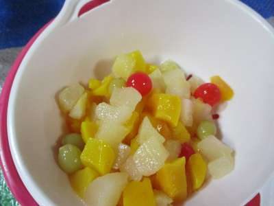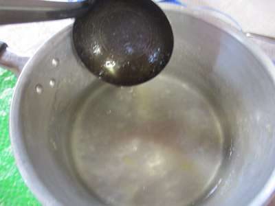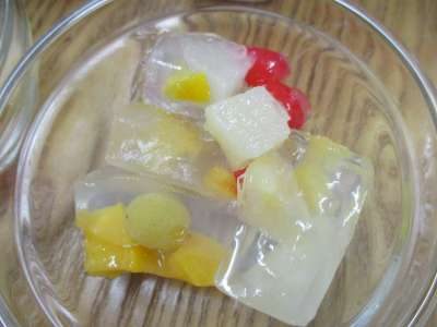 水とフルーツのシロップと砂糖と粉ゼラチンを温めます