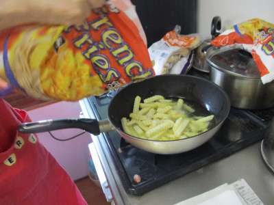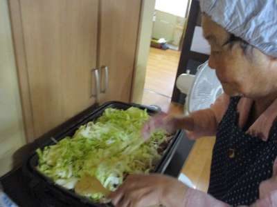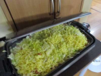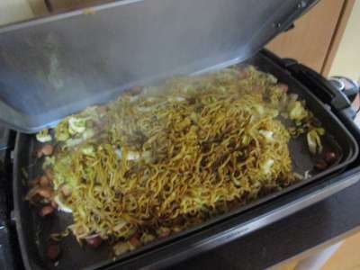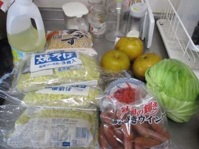ウインナー、キャベツ、もやし、麺を炒めて焼きそばです