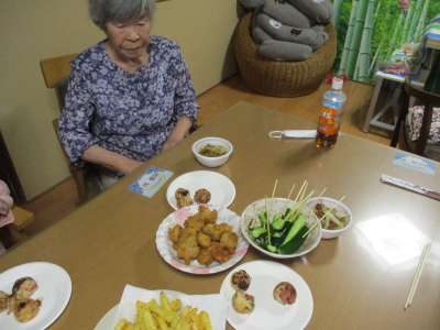 たこ焼きに、焼きそば、フライドポテト、唐揚げ、胡瓜の