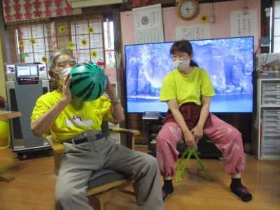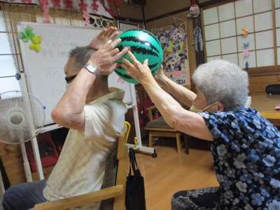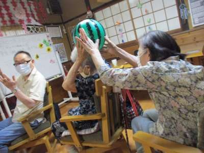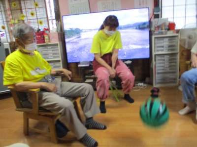 ボールはさみリレーは下肢筋力と腹筋も使う筋力体操です