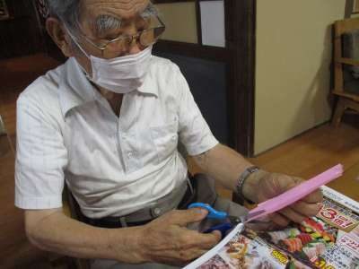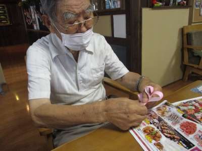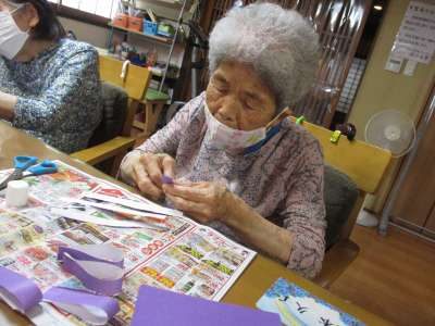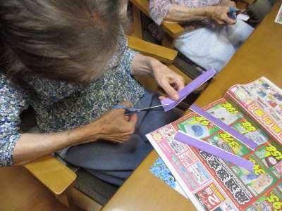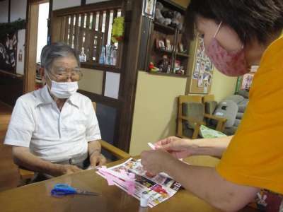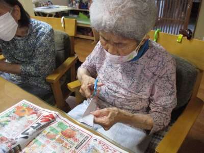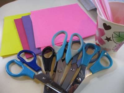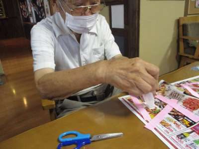 折り紙を折って、ハサミで切ります