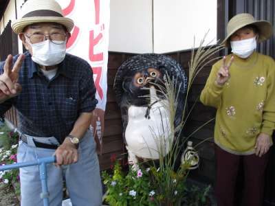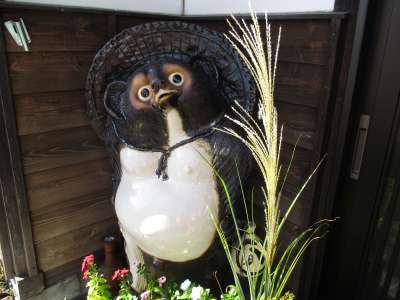お散歩から帰ってきて、たぬきさんの前で記念撮影