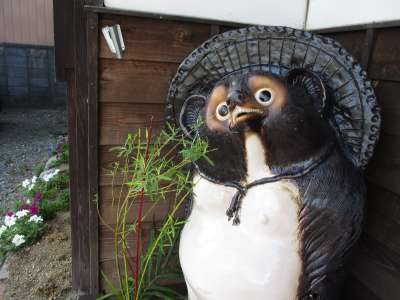 目印は玄関の前にある、信楽焼のたぬきさんです
