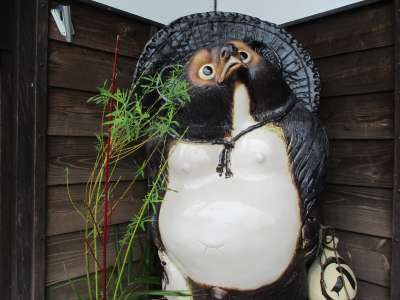 真心の幸望庵の門番のたぬき様が見上げている空は