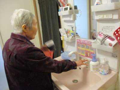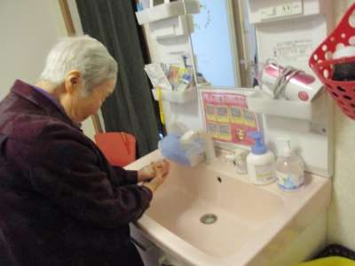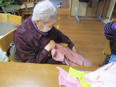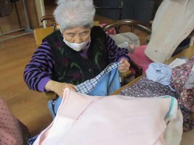 手洗い・うがいを終えて、洗濯物をたたんで下さる母達