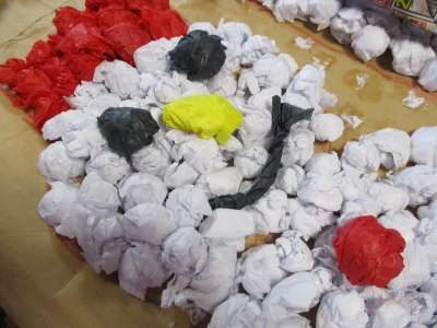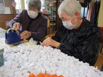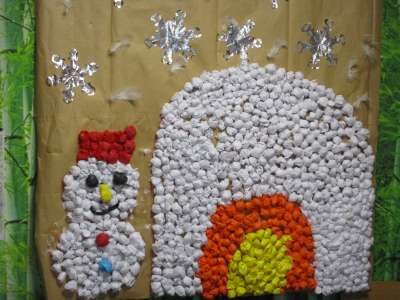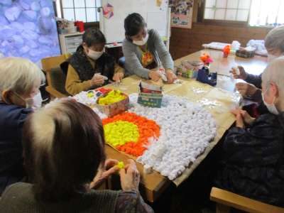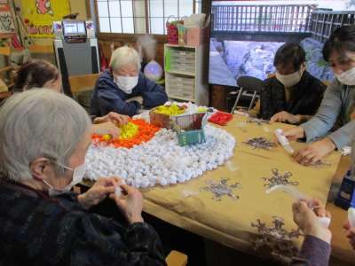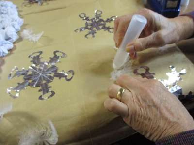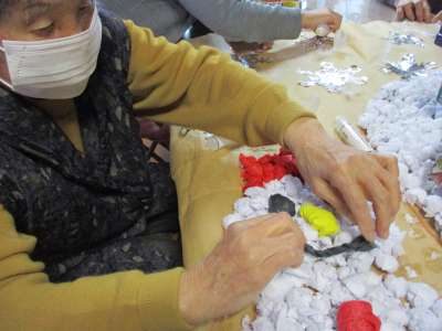 先日作った雪の結晶の切り紙を貼り付けていきます