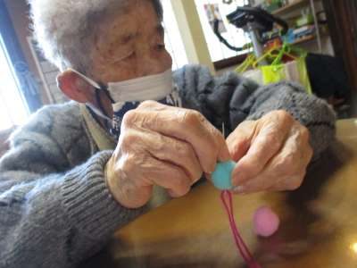 ここから、糸を通してつるし雛にします目がハート (顔)指でOK