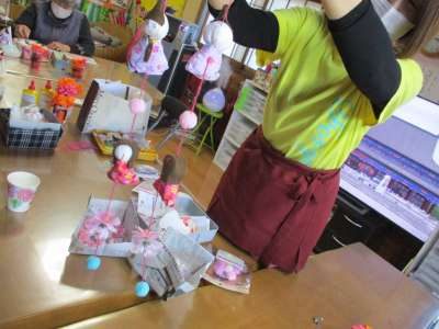 母は、お雛様、お内裏様作りをうれしい顔ハートたち (複数ハート)