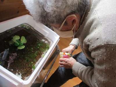 メダカのエサやりうれしい顔ハートたち (複数ハート)