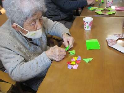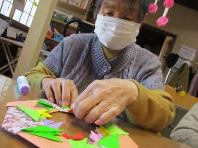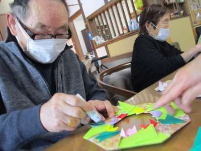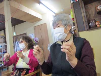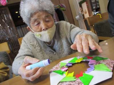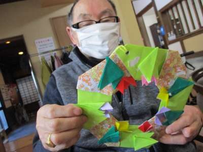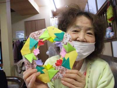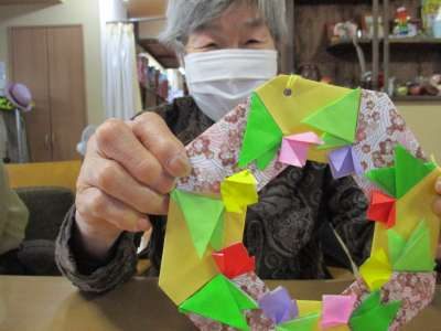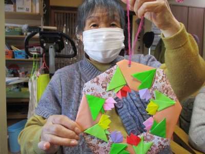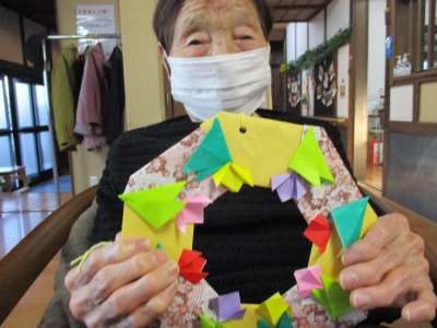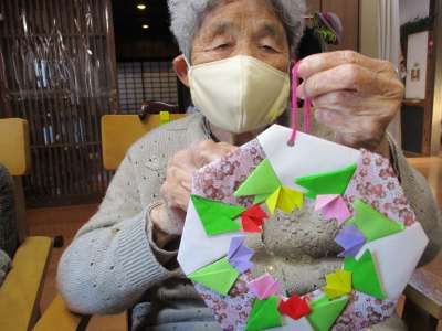 春らしいきれいな色合いのリースに笑顔満面の母です