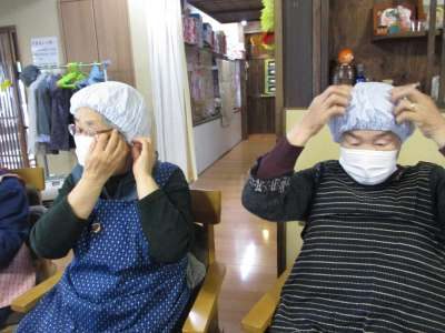 エプロン・帽子・手袋・マスク・手袋をして手指消毒