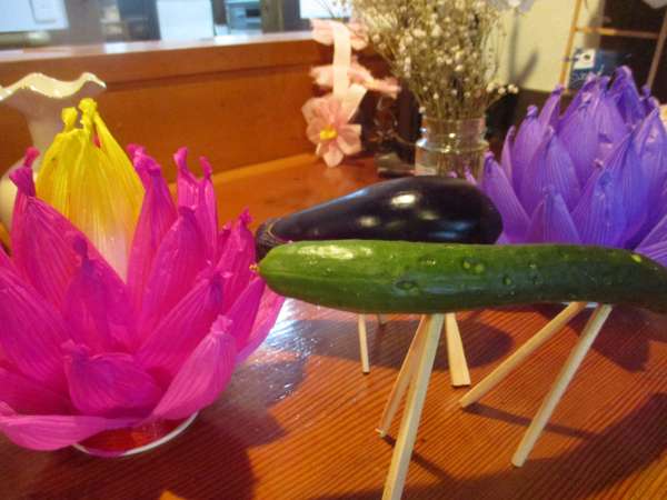 お盆なので、蓮の花とキュウの馬・ナスの牛を玄関に飾りました