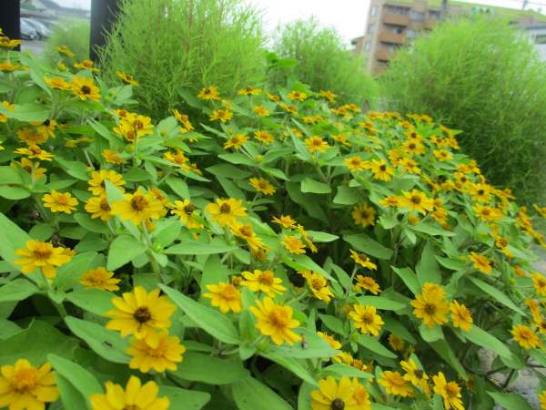 梅雨時に植えたメランポジウムの花が夏の暑さと共にぐんぐん大きく育っております