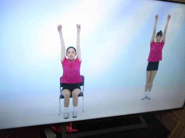 ラジオ体操で体を動かしていきます目がハート (顔)指でOK