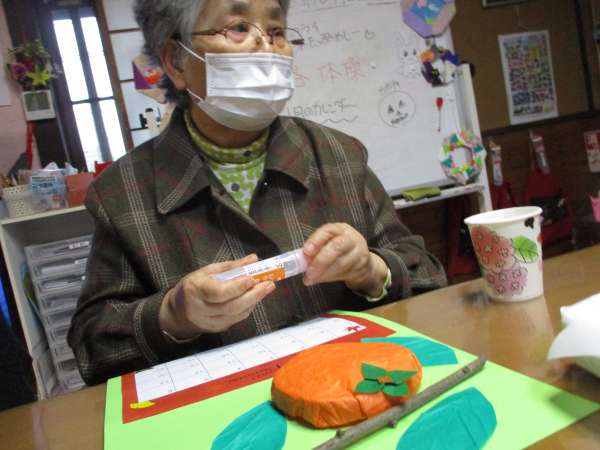牛乳パックで作った輪を使って立体的な柿を作ります