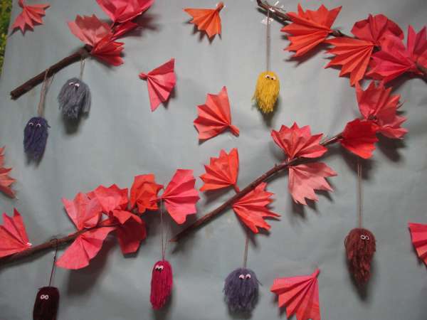 先日作った紅葉の葉っぱと木の枝に壁画として