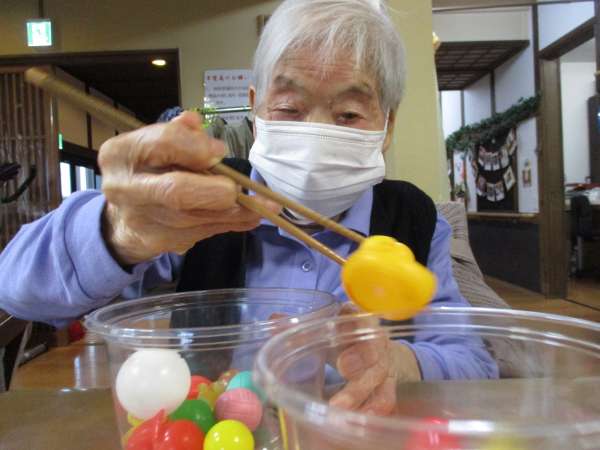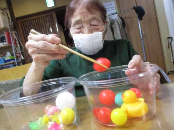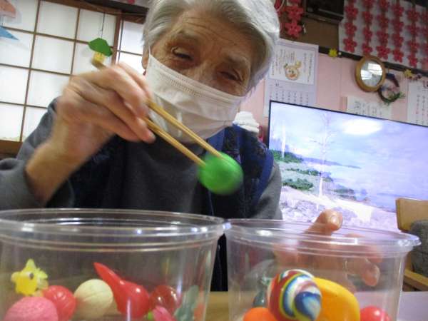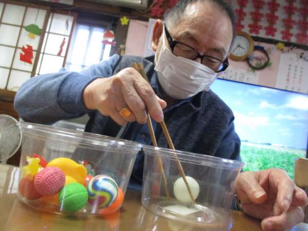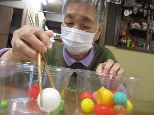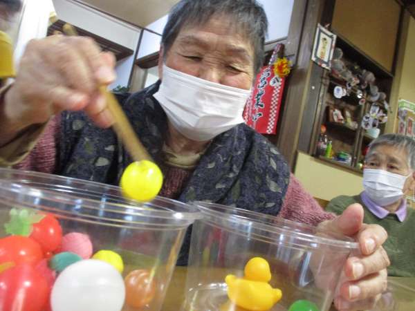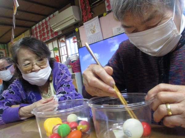 小さなゴムボールやゴムで出来た🐤ヒヨコをお箸でつまみながらのチーム戦です