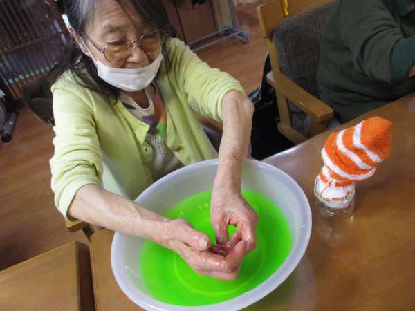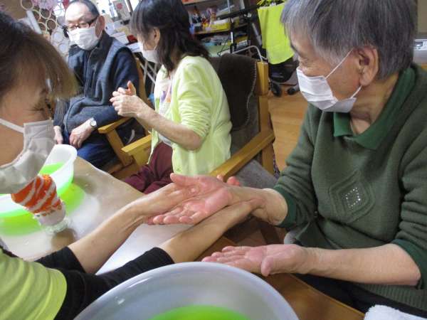 母の手、きれいなピンク色になりましたほっとした顔揺れるハート