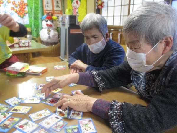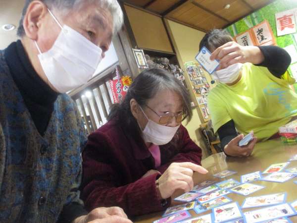 本日の午後レクは昔懐かしあせあせ (飛び散る汗)かるたとりムード