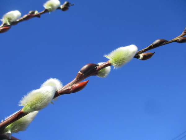 玄関先に生けた猫柳の冬芽から花穂が出始めました