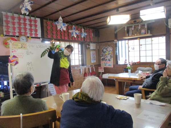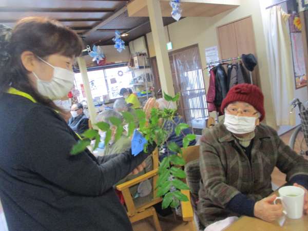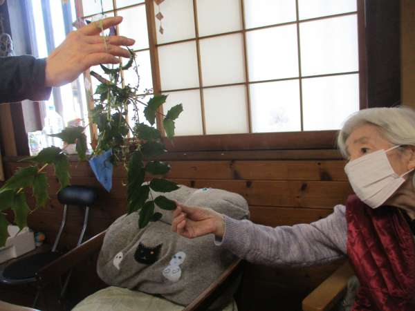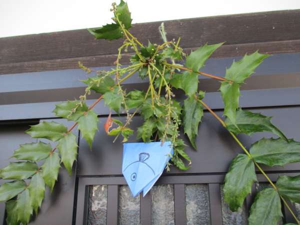 家の玄関先に飾る、葉のついた柊の枝に焼いた鰯の頭を刺したものです。