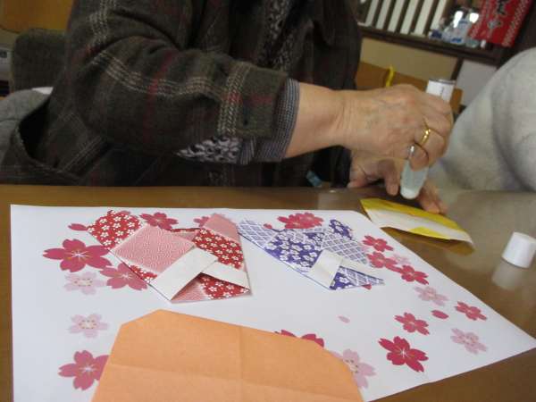 桜柄の台紙にお内裏猫ちゃんとお雛様猫ちゃんをきれいに貼り付けます