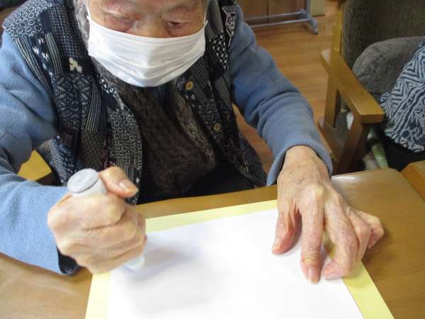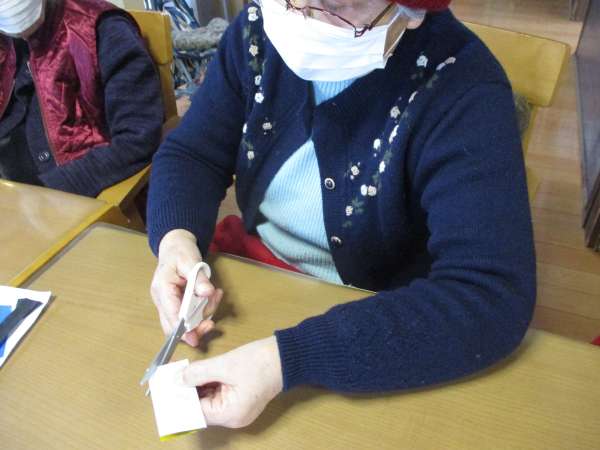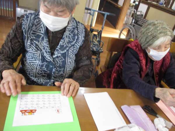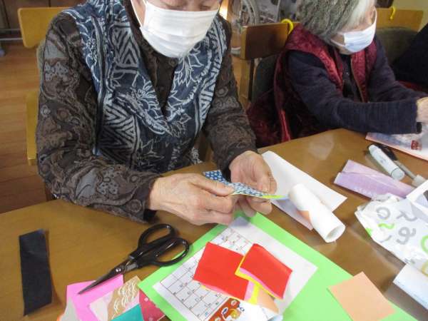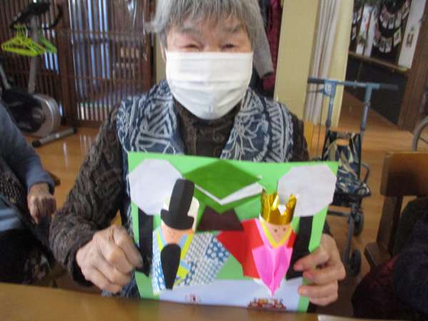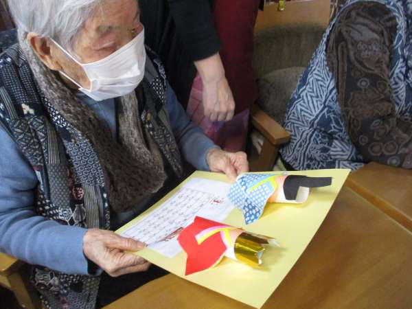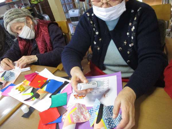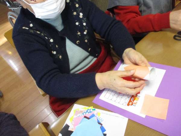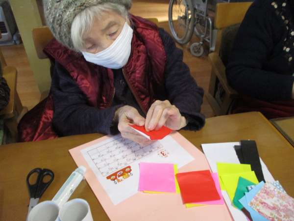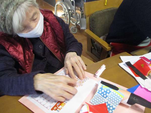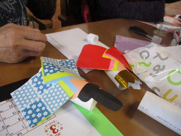 色のある折り紙を、着物に見立てて貼っていきますほっとした顔揺れるハート