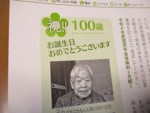 2月1日のお誕生日で100歳を迎え広報に載りました