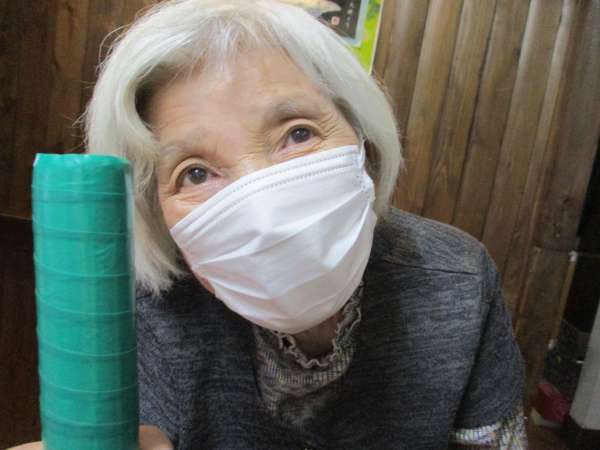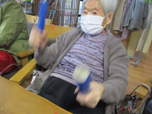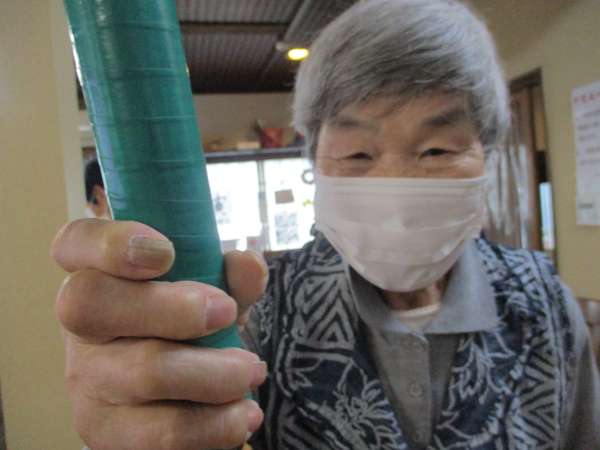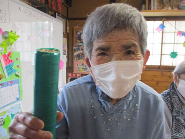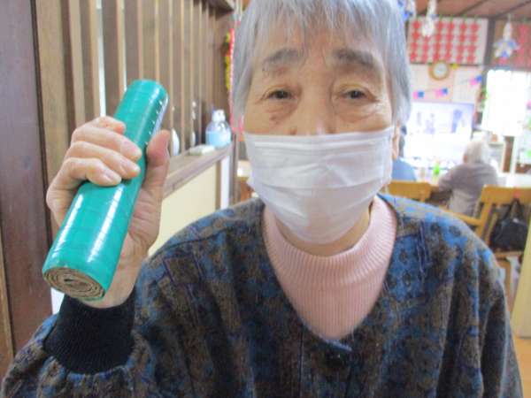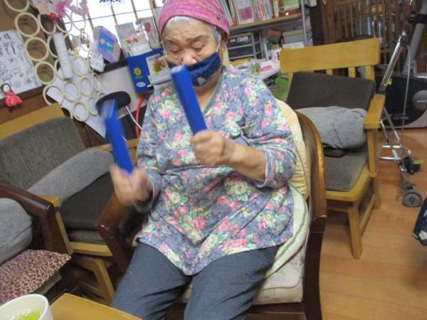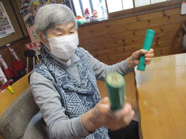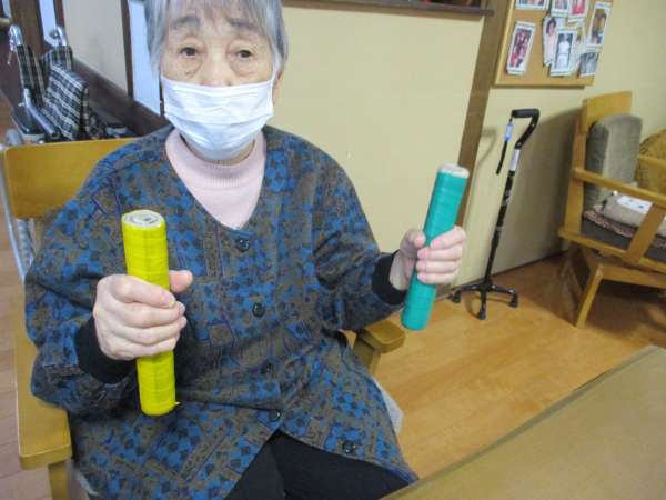 今日は、新聞紙をまいて作った手作りダンベルを持って体操しました