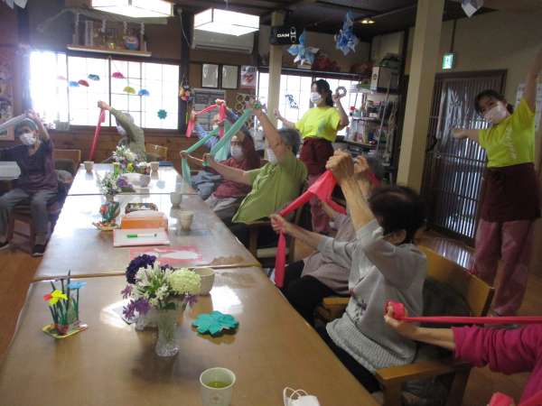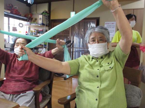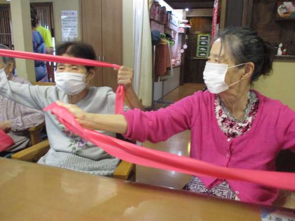 ゴムを使っての体操ではゴムの伸縮を利用して筋肉の可動域を広げていきます